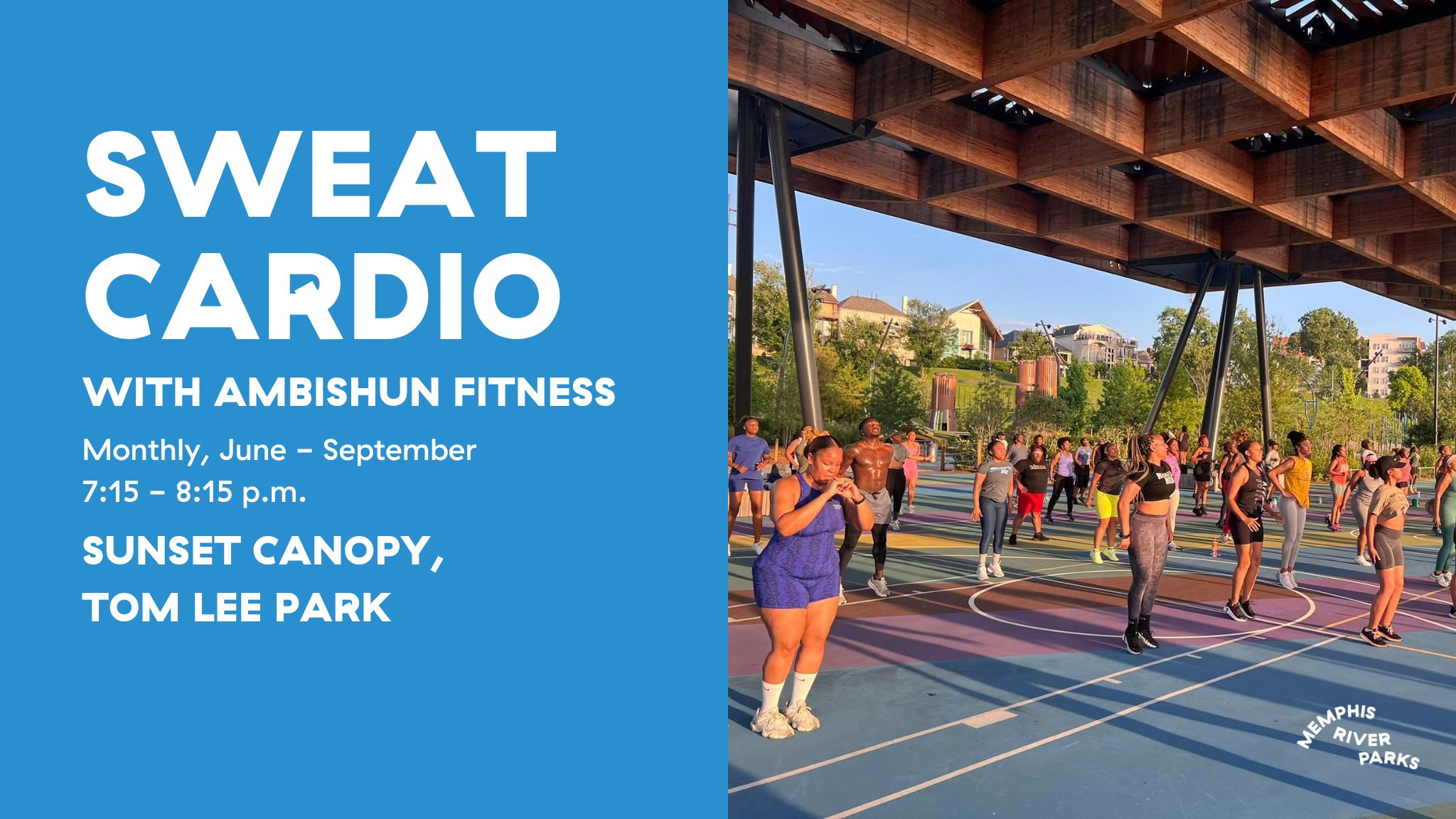 The riverfront is heating up with the return of FREE Sweat Cardio classes! Join Instructor Ricky with Ambishun Fitness for a fun, full-body workout on select Mondays under the Sunset Canopy at Tom Lee Park.